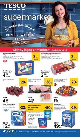 Nowa gazetka promocyjna sieci sklepów Tesco. Polecane promocje z gazetki Tesco: Jaja od kur z chowu klatkowego Tesco 2x10 sztuk - 5,98 zł. Papier toaletowy Mola 32 rolki - 15,99 zł. Mleko Bebilon 1200 g - 49,49 zł. …