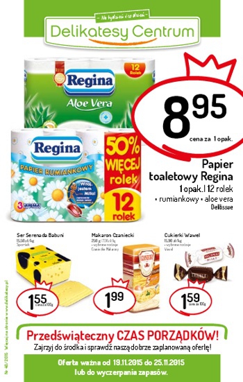 {loadposition linkDelikatesyCentrum} Nowa gazetka promocyjna Delikatesów Centrum. Polecane promocje z gazetki Delikatesów Centrum: Papier toaletowy Regina 12 rolek - 8,95 zł. Ser Serenada Babuni 100 g - 1,55 zł. Makaron Czaniecki 250 g - 1,99 zł. Oferta ważna…
