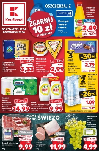 {loadposition linkKaufland} Nowa gazetka promocyjna sieci marketów Kaufland. Polecane promocje z gazetki Kaufland: Masło Łowickie Ekstra 200 g - 3,33 zł. Papier toaletowy Regina 16 rolek - 13,99 zł. Płyn do mycia naczyń Fairy 2x900 ml - 9,99 zł.…