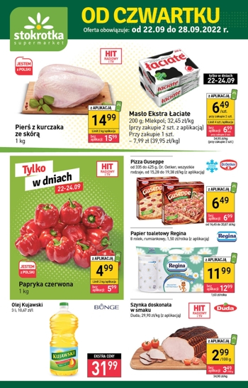 {loadposition linkStokrotka} Nowa gazetka promocyjna sieci sklepów Stokrotka. Polecane promocje z gazetki Stokrotka: Pierś z kurczaka ze skórą 1 kg - 14,99 zł*. Pizza Guseppe wszytskie rodzaje - 6,49 zł**. Papier toaletowy Regina rumiankowy 8 rolek - 11,99 zł***.…