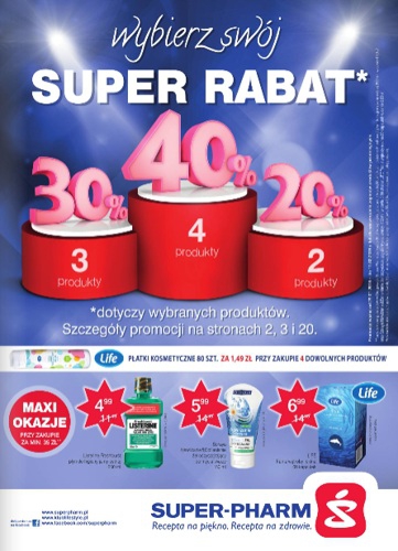 Nowa gazetka promocyjna Super-Pharm - "Wybierz swój super rabat". Polecane promocje z gazetki Super-Pharm: Szampon do włosów SYOSS 500 ml - 8,99 zł. Mleczko do ciała Ziaja 400 ml - 7,99 zł. Papier toaletowy rumiankowy Velvet 8 rolek…