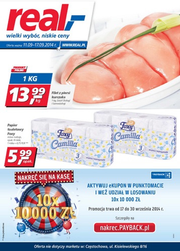 Nowa gazetka promocyjna sieci handlowej Real. Polecane promocje z gazetki Real: Filet z piersi kurczaka 1 kg - 13,99 zł. Papier toaletowy Foxy 8 rolek - 5,99 zł. Marchew 1 kg - 0,79 zł. Oferta ważna od…