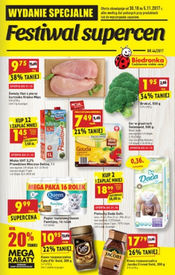 {loadposition linkBiedronka2} Nowa gazetka promocyjna sieci sklepów Biedronka - "Festiwal super cen". Polecane promocje z gazetki sieci Biedronka: Świeży filet z piersi kurczaka Kraina Mięs 1 kg - 9,75 zł. Brokuł 500 g - 1,95 zł. Papier…