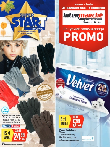 {loadposition linkIntermarche} Nowa gazetka promocyjna sieci sklepów Intermarche - "Co tydzień świeża porcja promo". Polecane promocje z gazetki Intermarche: Rękawiczki skórzane - 24,99 zł. Papier toaletowy Velvet Delikatnie Biały 8 rolek - 5,99 zł. Ser Mozzarella…