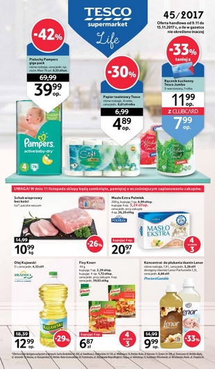 Nowa gazetka promocyjna sieci sklepów Tesco. Polecane promocje z gazetki Tesco: Pieluchy Pampers Giga Pack - 39,99 zł. Papier toaletowy Tesco 8 rolek - 4,89 zł. Ręcznik kuchenny Tesco Jumbo 3-warstwowy 1 rolka - 7,99 zł*. *…