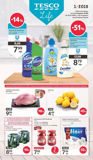 Nowa gazetka promocyjna sieci sklepów Tesco. Polecane promocje z gazetki Tesco: Płyn do WC Domestos 1,25 L - 7,99 zł. Koncentrat do płukania Coccolino 2 L - 8,79 zł. Papier toaletowy Velvet 12 rolek - 7,49 zł. …