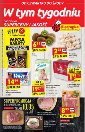 {loadposition linkBiedronka2} Nowa gazetka promocyjna sieci sklepów Biedronka - "W tym tygodniu". Polecane promocje z gazetki sieci Biedronka: Kiwi 1 kg - 6,95 zł. Pieczarki 500 g - 2,95 zł. Papier toaletowy Velvet Delikatnie Biały 24 rolki…