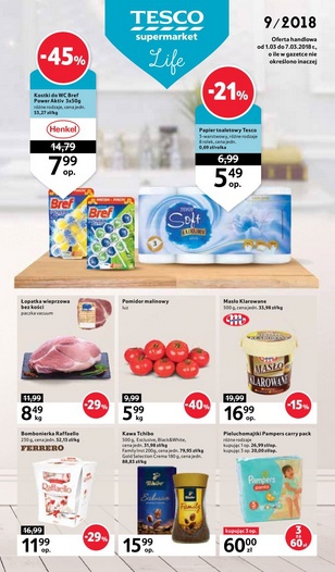 Nowa gazetka promocyjna sieci sklepów Tesco. Polecane promocje z gazetki Tesco: Kostka do WC Bref Power Aktiv 3x50 g - 7,99 zł. Papier toaletowy Tesco 3-warstwowy 8 rolek - 5,49 zł. Łopatka wieprzowa bez kości 1 kg -…