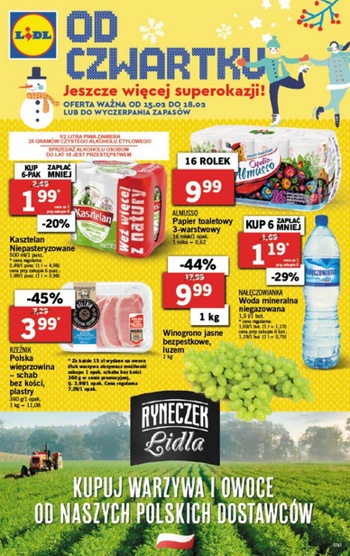 {loadposition linkLidl2} 'Od czwartku jeszcze więcej superokazji!' - żółta gazetka promocyjna sieci sklepów Lidl. Polecane promocje z gazetki sklepów Lidl: Piwo Kasztelan Niepasteryzowane 6x500 ml - 11,94 zł. Papier toaletowy Almusso 16 rolek - 9,99 zł. Winogrono jasne…