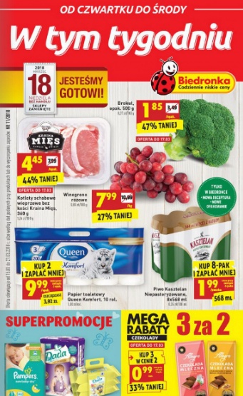 {loadposition linkBiedronka2} 'W tym tygodniu' - nowa gazetka promocyjna sieci sklepów Biedronka. Polecane promocje z gazetki sieci Biedronka: Brokuł 500 g - 1,85 zł. Papier toaletowy Queen Komfort 2x10 rolek - 19,98 zł. Piwo Kasztelan Niepasteryzowane 8x568 ml -…