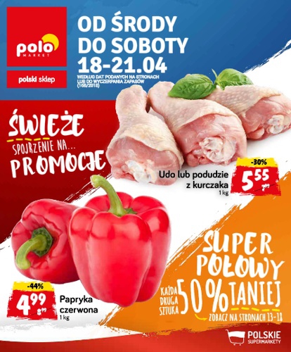 {loadposition linkPoloMarket} 'Świeże spojrzenie na... promocje' - nowa gazetka promocyjna sieci sklepów Polo Market. Polecane promocje z gazetki Polo Market: Udo lub podudzie z kurczaka 1 kg - 5,55 zł. Papryka czerwona 1 kg - 4,99 zł.…