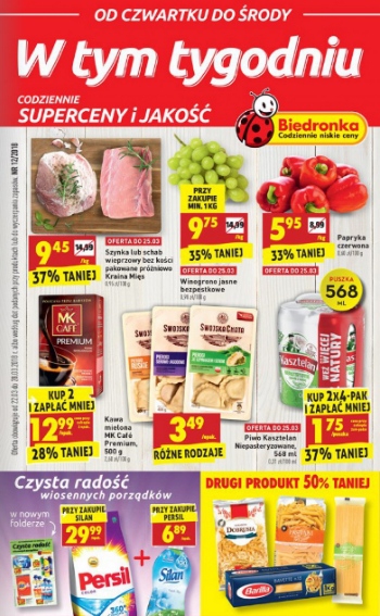 {loadposition linkBiedronka1} 'W tym tygodniu' - nowa gazetka promocyjna sieci sklepów Biedronka. Polecane promocje z gazetki sieci Biedronka: Świeży filet z piersi kurczaka Kraina Mięs 1 kg - 9,99 zł. Papryka czerwona 1 kg - 4,95 zł. Kawa…