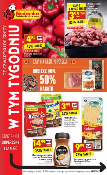 {loadposition linkBiedronka1} 'W tym tygodniu' - nowa gazetka promocyjna sieci sklepów Biedronka. Polecane promocje z gazetki sieci Biedronka: Papryka czerwona 1 kg - 4,95 zł. Płatki Nestle różne rodzaje - 3,99 zł. Ser Salami w plastrach Światowid…