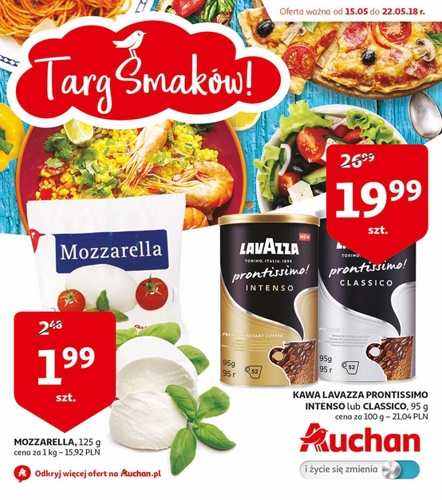 {loadposition linkAuchan} 'Targ smaków!' - nowa gazetka promocyjna sieci marketów Auchan. Polecane promocje z gazetki Auchan: Mozzarella 125 g - 1,99 zł. Kawa Lavazza Prontissimo Intenso lub Classico 95 g - 19,99 zł. Papryka trikolor 500 g - 4,99…