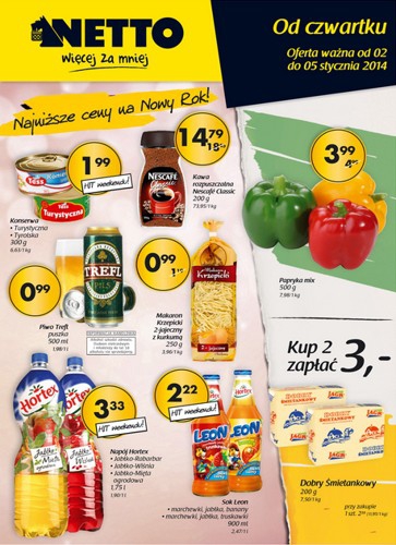 {loadposition linkNetto} Nowa gazetka promocyjna Netto - "Najniższe ceny na Nowy Rok!". Polecane promocje z gazetki Netto: Papryka mix 500 g - 3,99 zł. Piwo Trefl 500 ml - 0,99 zł. Sok Leon 900 ml - 2,22 zł.…