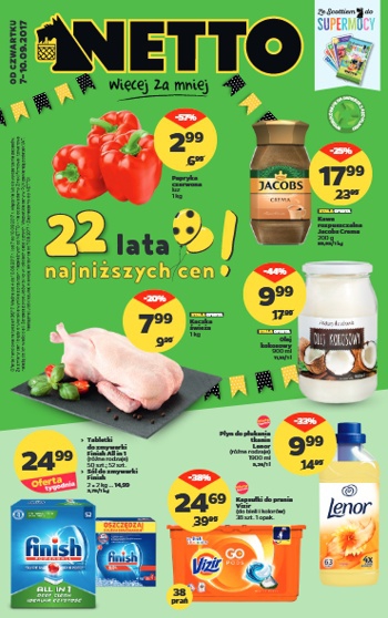 {loadposition linkNetto} Nowa gazetka promocyjna Netto - "22 lata najniższych cen!". Polecane promocje z gazetki Netto: Papryka czerwona 1 kg - 2,99 zł. Kawa rozpuszczalna Jacobs Crema 200 g - 17,99 zł. Kaczka świeża 1 kg…