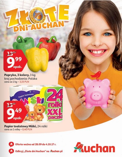 {loadposition linkAuchan} Nowa gazetka promocyjna Auchan - "Złote dni Auchan". Polecane promocje z gazetki Auchan: Papryka 3 kolory 3 kg - 9,99 zł. Papier toaletowy Miśki 24 rolki - 9,49 zł. Szynka Eksportowa Krakus 2x120 g…