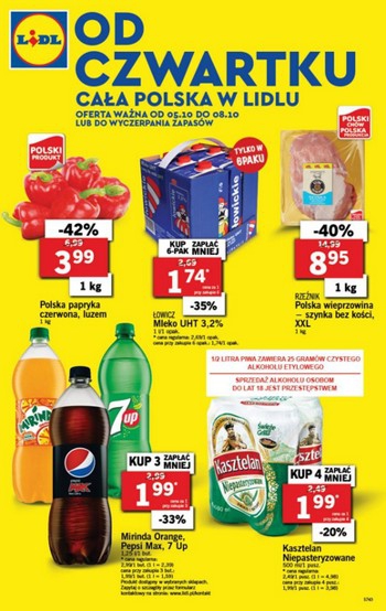 {loadposition linkLidl2} Nowa żółta gazetka promocyjna sieci sklepów Lidl - "Od czwartku cała Polska w Lidlu". Polecane promocje z gazetki sklepów Lidl: Polska papryka czerwona 1 kg - 3,99 zł. Mleko Łowicz 6x1 L - 10,44 zł.…