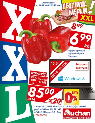 {loadposition linkAuchan} Nowa gazetka promocyjna Auchan - "XXL". Polecane promocje z gazetki Auchan: Laptop HP G3 - 1700 zł. Papryka czerwona 1 kg - 6,99 zł. Ziemniaki 10 kg - 7,99 zł. Oferta ważna od 4.02 do 9.02.