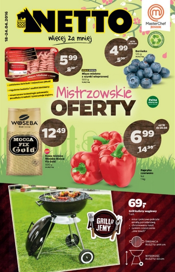 {loadposition linkNetto} Nowa gazetka promocyjna Netto - "Mistrzowskie oferty". Polecane promocje z gazetki Netto: Mięso mielone z szynki wieprzowej 500 g - 5,99 zł. Papryka czerwona 1 kg - 6,99 zł. Grill węglowy kulisty - 69,99 zł. …