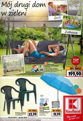 {loadposition linkKaufland} Nowa gazetka promocyjna marketu Kaufland - "Mój drugi dom w zieleni". Polecane promocje z gazetki Kaufland: Huśtawka Hollywood - 199,90 zł. Parasol przeciwsłoneczny - 19,99 zł. Krzesło ogrodowe - 22,99 zł. Oferta ważna od 30.04 do…