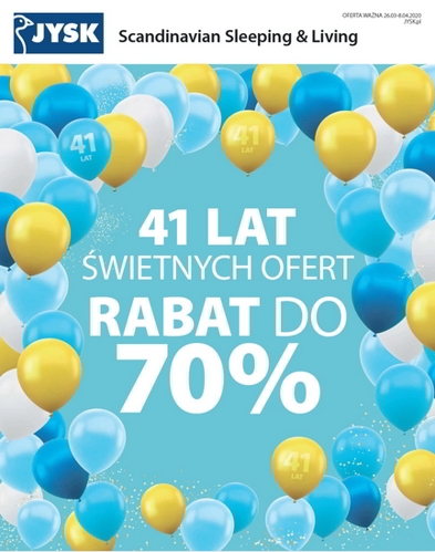 '41 lat świetnych ofert' - nowa gazetka promocyjna sieci sklepów JYSK. Polecane promocje z gazetki Jysk: Rabat 20-49% na wybrane parasole ogrodowe. Rabat 20-50% na szeroki wybór krzeseł do jadalni. Rabat 30-60% na wybrane lustra. …
