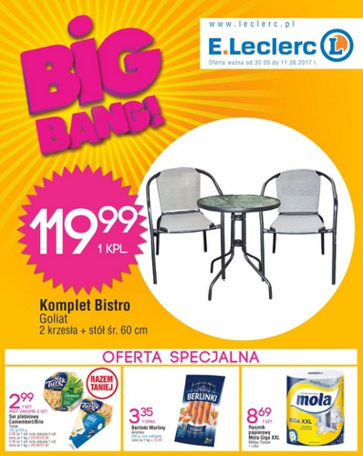 {loadposition linkEleclerc} Nowa gazetka promocyjna sieci handlowej E.Leclerc - "Big Bang!". Polecane promocje z gazetki E.Leclerc: Komplet bistro Goliat - 111,99 zł. Parówki Berlinki Morliny 250 g - 3,35 zł. Ręcznik papierowy Mola Giga XXL - 8,69 zł. …