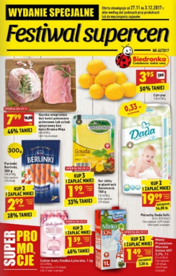 {loadposition linkBiedronka} Nowa gazetka promocyjna sieci sklepów Biedronka - "Festiwal super cen". Polecane promocje z gazetki sieci Biedronka: Szynka wieprzowa bez kości pakowana próżniowo lub schab wieprzowy Kraina Mięs 1 kg - 7,99 zł. Cytryny 1 kg -…