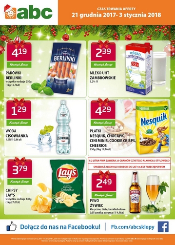 Nowa gazetka promocyjna sieci sklepów ABC. Polecane promocje z gazetki ABC: Parówki Berlinki 250 g - 4,19 zł. Woda Cisowianka 1,5 L - 1,29 zł. Piwo Żywiec 500 ml - 2,49 zł. Oferta ważna…