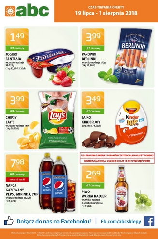 Nowa gazetka promocyjna sieci sklepów ABC. Polecane promocje z gazetki ABC: Parówki Berlinki 250 g - 3,99 zł. Jajko Kinder Joy 20 g - 3,49 zł. Piwo Warka Radler 500 ml - 2,69 zł. …