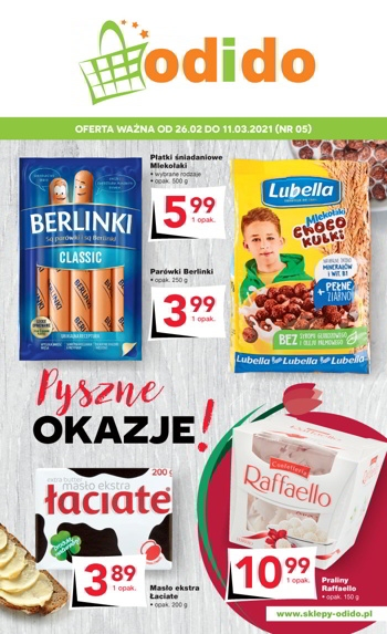 'Pyszne okazje!' - nowa gazetka promocyjna sklepów Odido. Polecane promocje z gazetki Odido: Płatki śniadaniowe Mlekołaki 500 g - 5,99 zł. Parówki Berlinki 250 g - 3,99 zł. Masło ekstra Łaciate 200 g - 3,89 zł. Oferta…