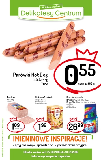 {loadposition linkDelikatesyCentrum} Nowa gazetka promocyjna Delikatesów Centrum. Polecane promocje z gazetki Delikatesów Centrum: Parówki Hot Dog 100 g - 0,55 zł. Tyrolska Sokołów 100 g - 1,09 zł. Makaron Czaniecki 250 g - 1,99 zł. Oferta ważna od…
