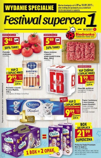 {loadposition linkBiedronka} Nowa gazetka promocyjna sieci sklepów Biedronka - "Festiwal super cen 1". Polecane promocje z gazetki sieci Biedronka: Pomidory malinowe 1 kg - 3,45 zł. Mięso mielone z łopatki wieprzowej Kraina Mięs 500 g - 5,49…