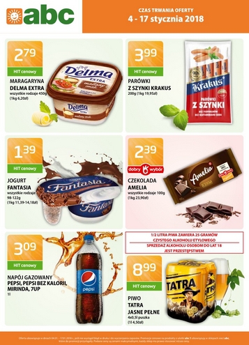 Nowa gazetka promocyjna sklepów ABC. Polecane promocje z gazetki ABC: Majonez Dekoracyjny Winiary 300 ml - 3,69 zł. Parówki Krakus z szynki 200 g - 3,99 zł. Mleko Mleczna Zagroda 1 L - 1,99 zł. Oferta ważna…