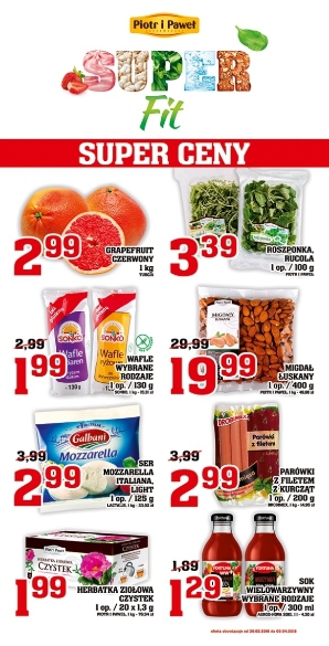 Nowa gazetka promocyjna sieci sklepów Piotr i Paweł - "Super Fit". Polecane promocje z gazetki Piotr i Paweł: Grapefruit czerwony 1 kg - 2,99 zł. Migdały łuskane 400 g - 19,99 zł. Parówki z filetem z kurcząt Drobimex…