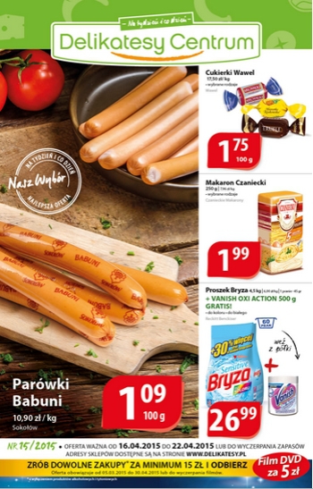 {loadposition linkDelikatesyCentrum} Nowa gazetka promocyjna Delikatesów Centrum. Polecane promocje z gazetki Delikatesów Centrum: Parówki Babuni Sokołów 100 g - 1,09 zł. Cukierki Wawel 100 g - 1,75 zł. Makaron Czaniecki 250 g - 1,99 zł. Oferta ważna od…