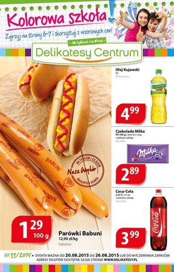 {loadposition linkDelikatesyCentrum} Nowa gazetka promocyjna Delikatesów Centrum. Polecane promocje z gazetki Delikatesów Centrum: Parówki Babuni 100 g - 1,29 zł. Olej Kujawski 1 L - 4,99 zł. Czekolada Milka 100 g - 2,89 zł. Oferta ważna od 20.08…