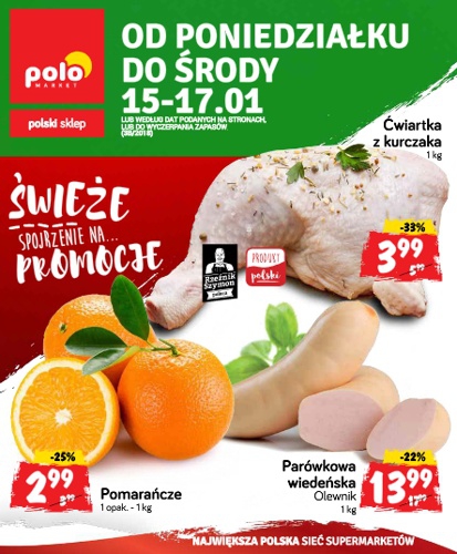{loadposition linkPoloMarket} Nowa gazetka promocyjna Polo Market - "Świeże spojrzenie na... promocje". Polecane promocje z gazetki Polo Market: Ćwiartka z kurczaka 1 kg - 3,99 zł. Pomarańcze 1 kg - 2,99 zł. Parówkowa wiedeńska Olewnik 1…