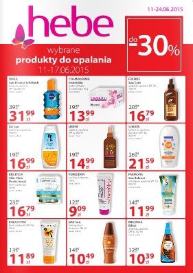 {loadposition linkHebe} Nowa gazetka promocyjna drogerii Hebe - "Wybrane produkty do opalania do -30%". Polecane promocje z gazetki Hebe: Spray do opalania Nivea Protect & Refresh 200 ml - 31,99 zł. Pasta cukrowa do depilacji Cosmoderma Sweetskin 170 g…
