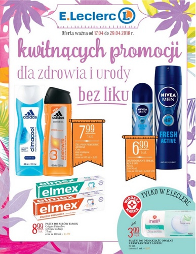 {loadposition linkEleclerc} 'Kwitnących promocji dla zdrowia i urody bez liku' - nowa gazetka promocyjna sieci handlowej E.Leclerc. Polecane promocje z gazetki E.Leclerc: Żel pod prysznic Adidas 400 ml - 7,99 zł. Dezodorant Nivea różne rodzaje - 6,99 zł.…