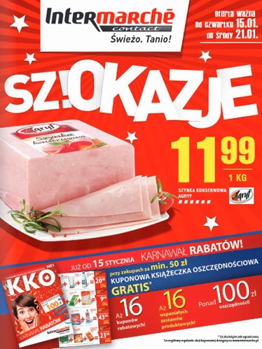 {loadposition linkIntermarche} Nowa gazetka promocyjna sieci handlowej Intermarche - "Sz!okazje". Polecane promocje z gazetki Intermarche: Szynka konserwowa Agryf 1 kg - 11,99 zł. Pasta do zębów Colodent 100 ml - 2,99 zł. Płyn do mycia naczyń Apta 1 L…