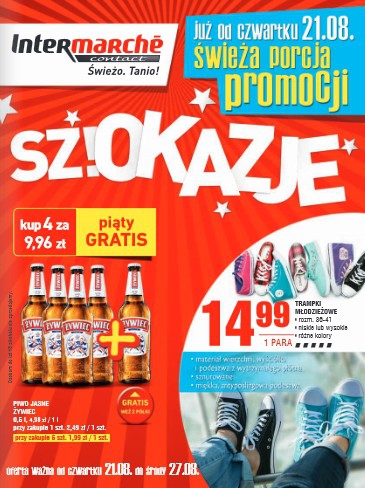 {loadposition linkIntermarche} Nowa gazetka promocyjna sieci handlowej Intermarche - "Sz!okazje". Polecane promocje z gazetki Intermarche: Piwo Żywiec 5x500 ml - 9,96 zł. Trampki młodzieżowe - 14,99 zł. Pasta do zębów Sensodyne 75 ml - 9,99 zł. Oferta ważna…