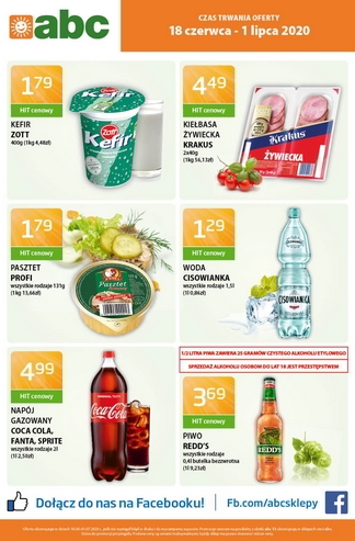 {loadposition linkABC} Nowa gazetka promocyjna sieci sklepów ABC. Polecane promocje z gazetki ABC: Kefir Zott 400 g - 1,79 zł. Pasztet Profi 131 g - 1,79 zł. Kiełbasa żywiecka Krakus 2x40 g - 4,49 zł. Oferta ważna…