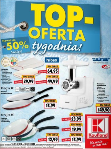 {loadposition linkKaufland} Nowa gazetka promocyjna marketu Kaufland - "TOP-oferta tygodnia!". Polecane promocje z gazetki Kaufland: Maszynka do mielenia mięsa Zelmer 500 W - 149,90 zł. Patelnia z powłoką ceramiczną Dajar śr. 20 cm - 12,99 zł. Patelnia do naleśników…