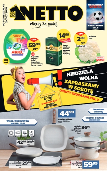 {loadposition linkNetto} 'Mistrzowska oferta' - nowa gazetka promocyjna sieci sklepów Netto. Polecane promocje z gazetki Netto: Patelnia do nalesników - 29,99 zł. Patelnia grillowa - 44,99 zł. Patelnia głęboka z pokrywką - 36,99 zł. Oferta ważna od…