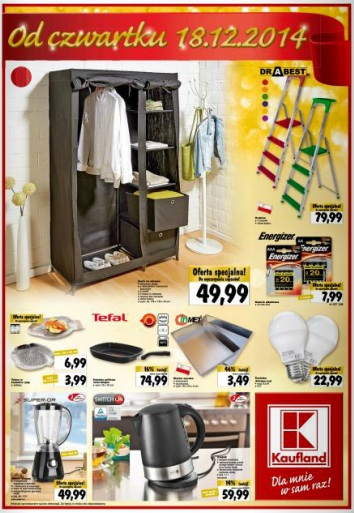 {loadposition linkKaufland} Nowa gazetka promocyjna marketu Kaufland. Polecane promocje z gazetki Kaufland: Szafa na ubrania - 49,99 zł. Patelnia grillowa Tefal Simple - 74,99 zł. Mikser stojący - 49,99 zł. Oferta ważna od 18.12 lub do wyczerpania…