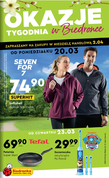 {loadposition linkBiedronka5} 'Okazje tygodnia' - nowa gazetka promocyjna sieci sklepów Biedronka. Polecane promocje z gazetki sieci Biedronka: Softshell damski lub męski - 74,90 zł. Patelnia Tefal Super Start - 69,90 zł*. Szczoteczka oscylacyjna Psi Patrol - 29,9 zł*. …
