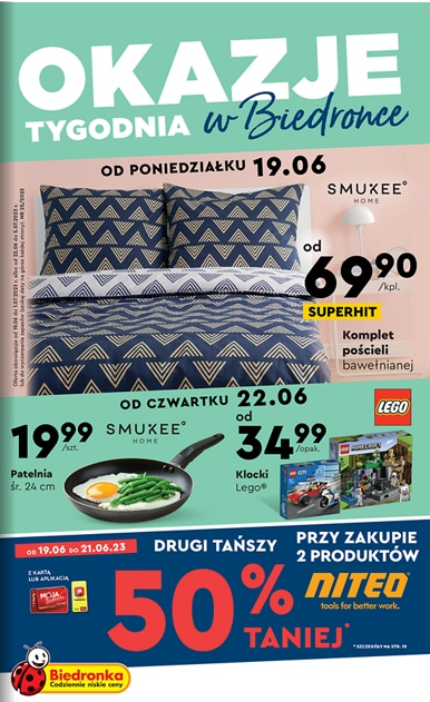{loadposition linkBiedronka4} 'Okazje tygodnia' - nowa gazetka promocyjna sieci sklepów Biedronka. Polecane promocje z gazetki sieci Biedronka: Komplet pościeli bawełnianej Smukee Home - od 69,90 zł. Patelnia Smukee Home 24 cm - 19,99 zł. Klocki LEGO - od 34,99…