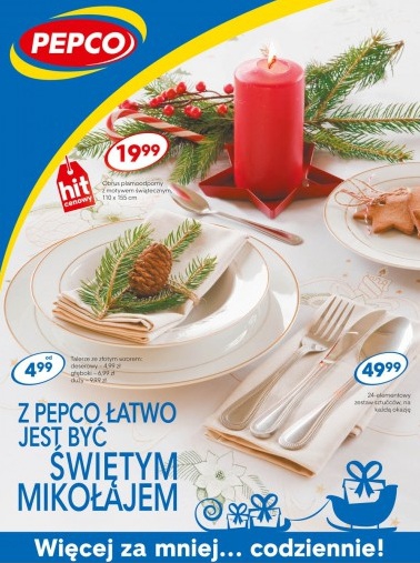 {loadposition linkPepco} Nowa gazetka promocyjna Pepco - "Z Pepco łatwo jest być Świętym Mikołajem". Polecane promocje z gazetki Pepco: Obrus plamoodporny z motywem świątecznym wym. 110x155 cm - 19,99 zł. Patera szklana - 19,99 zł. Puszysty koc z mikrofibry…