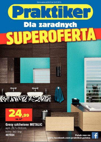Nowa gazetka promocyjna Praktiker - "superoferta". Polecane promocje z gazetki Praktiker: Gres szkliwiony Metalic m² - 24,99 zł. Trampolina z siatką zabezpieczającą - 549 zł. Pawilon ogrodowy - 399 zł. Oferta ważna od 3.07 do 15.07.